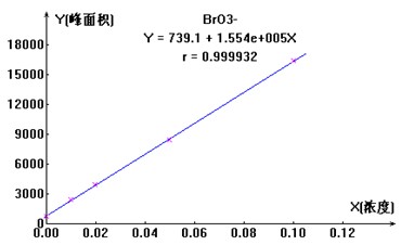 移取必然量的溴酸盐标液(1000μg/ml),设置装备摆设成浓度为10μg/ml的溴酸盐储蓄液,再别离移取0ml、0.1ml、0.2ml、0.5ml、1.0ml的10μg/ml的溴酸盐储蓄液至100ml玻璃容量瓶,并加超纯水定容,配制成0μg/l、10μg/l、20μg/l、50μg/l、100μg/l的系列规范溶液,以下图3 为BrO3-离子规范曲线图。